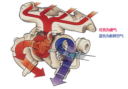 废气涡轮增压是目前世界上使用最多的发动机技术,涡轮增压器(Tubro)实际上就是一个空气压缩机。它是利用发动机排出的废气作为动力来推动涡轮室内的涡轮(位于排气道内),涡轮又带动同轴的叶轮位于进气道内,叶轮就压缩由空气滤清器管道送来的新鲜空气,再送入气缸。当发动机转速加快,废气排出速度与涡轮转速也同步加快,空气压缩程度就得以加大,发动机的进气量就相应地得到增加,就可以增加发动机的输出功率了。