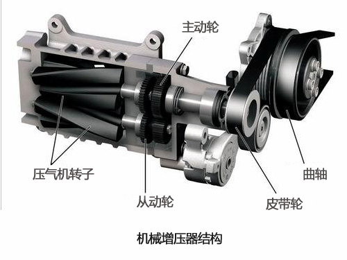 最为常见的两种增压方式为机械增压和涡轮增压,其中接卸增压器是与发动机一体的,它由发动机的曲轴带动增压器的叶片,因此会随着发动机的转速变化,机械增压器的好处是由于结构简单,而且由于工作温度低因此不需要冷却系统,不过它本身也有不少缺点,因为它需要靠发动机来带动工作,因此给发动机增加了负担,因此会影响转速。现在搭载机械增压的典型车型就是奔驰C200。