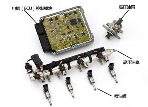 高压喷油系统主要可以分为发动机控制模块(ECU)、高压油轨、高压油泵和喷油嘴四部分,其中ECU主要采集发动机数据,按照预定程序控制喷油时机和喷油量,从而实现最高燃烧效率;而高压油泵则主要负责燃油的加压,高压油轨主要起均衡各喷油嘴喷射压力的作用,而最终的喷油任务则由喷油嘴来执行。此外,还有多个传感器提供燃油压力等信息,确保整个系统的高效率。