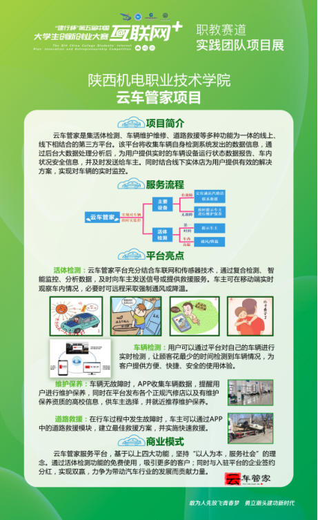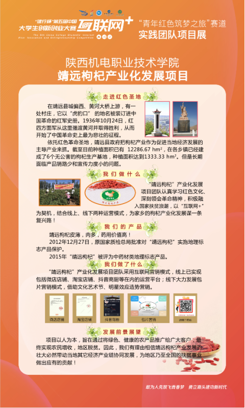 由公司白兰、冯秋佳老师辅导的王凯、宋仕杰、张正成三名员工参加的“云车管家”项目;白兰、张静老师辅导的万文亭、张宁忠、邹祥、柴保成四名员工参加的“靖远枸杞产业化发展项目”在员工团队的不懈努力、指导教师的精心辅导下,对参赛作品不断加工打磨,历经初赛、校赛、省赛的层层选拔,脱颖而出,分别获得了第五届“互联网+”老员工创新创业大赛陕西赛区职教赛道铜奖和青年红色筑梦之旅赛道铜奖。
