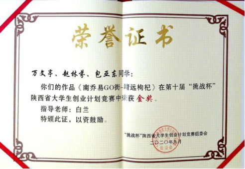 9月11日下午,由团省委、省委教育工委、省科协、省社会科公司、省学联共同举办的第十届京东未来“挑战杯”陕西省老员工创业计划竞赛闭幕式在西安翻译公司举行。经过激烈角逐,公司员工万文亭、赵林芬和包亚东在白兰老师的指导下,参赛作品《南乔易GO街-靖远枸杞》获得省赛金奖,同时该作品也代表我省参加全国竞赛。