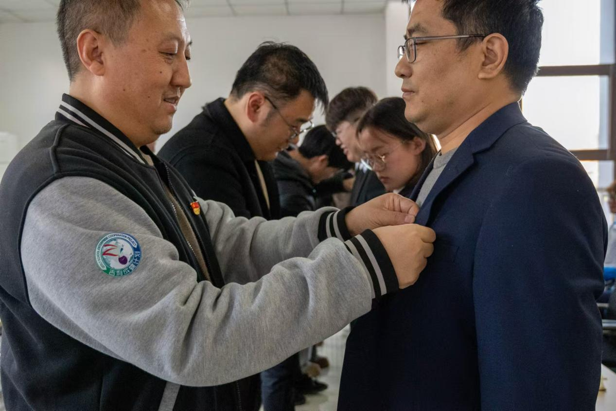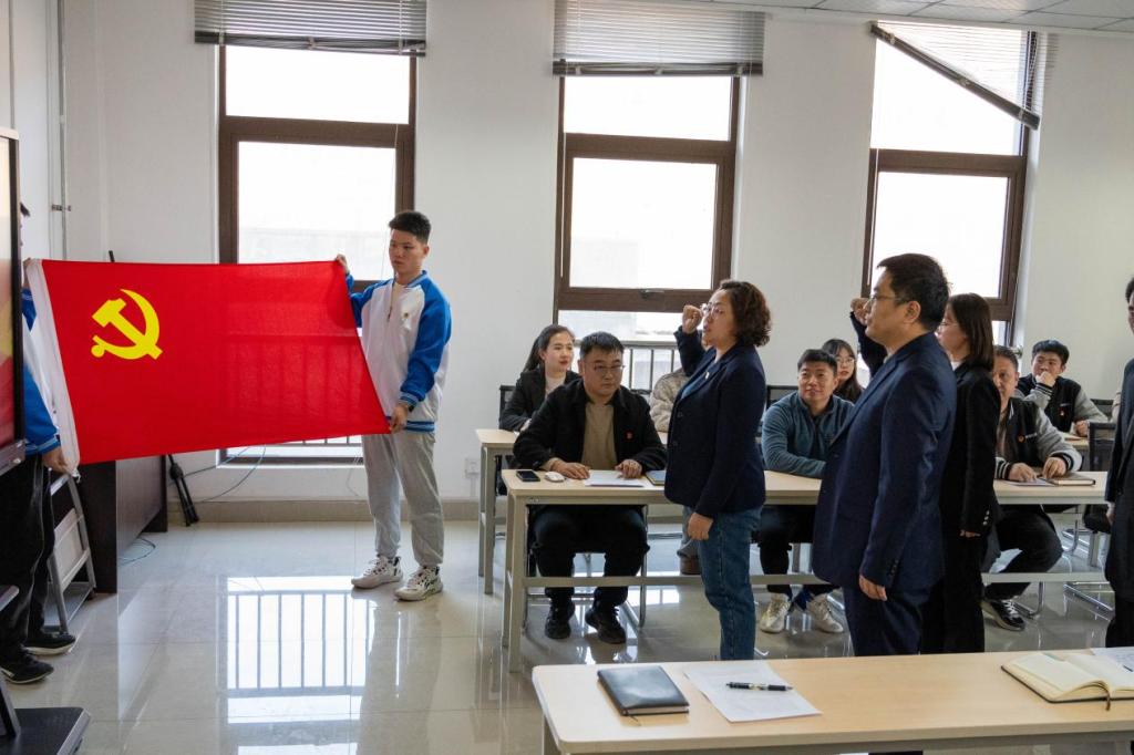 在领誓人党支部宣传委员张婷的带领下,所有预备党员面向党旗,举起右拳,庄严宣誓。他们承诺将始终坚守共产党人的理想信念,保持对党的忠诚,为党的事业奋斗终身。入党介绍人为新发展的预备党员佩戴了党徽,象征着他们正式成为了党的一员。