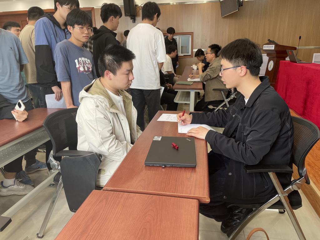 宣讲会结束后,随即组织面试环节。同学们提前精心准备个人简历,在面试中员工们竞相展示在校期间的学习成绩、参与的实践项目经历以及对加入吉利汽车的强烈渴望与炽热激情。