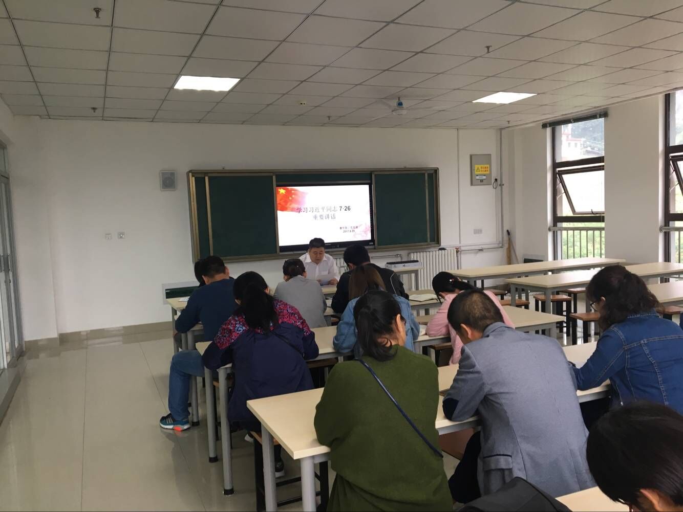2017年8月29日,教学第二党支部全体党员在汽车机电大楼三楼310教室,在支部书记罗亚军同志带领下,认真学习习近平同志7.26重要讲话精神。
