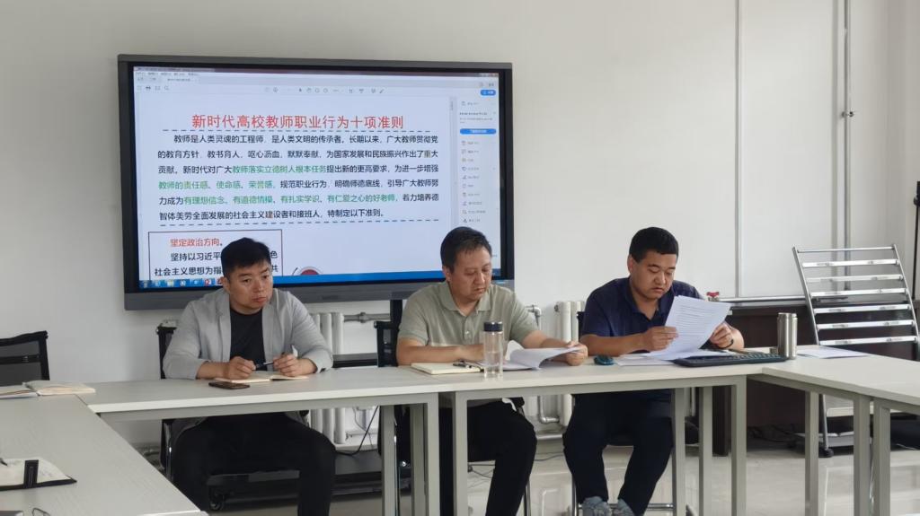 会议伊始,李靖带领全体教师学习了《新时代高校教师职业行为十项准则》及《关于加强和改进新时代师德师风建设的意见》,深入领会文件精神,熟悉师德师风相关制度和要求。