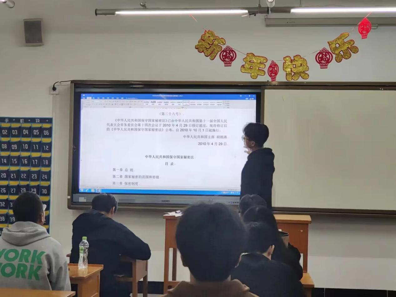 在“增强保密意识,筑牢国家安全防线”主题教育班会中,各班班长带领同学们一起学习了《中华人民共和国保守国家秘密法》,列举了危害国家秘密安全的行为,讲解了国家秘密的等级分类。